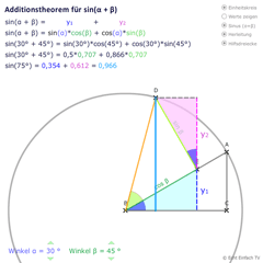 In diesem video zeigen wir die grafische herleitung des additionstheorems für sinus mit sin(a+ß) = sin(a)*cos(ß)+cos(a)*sin(ß) .